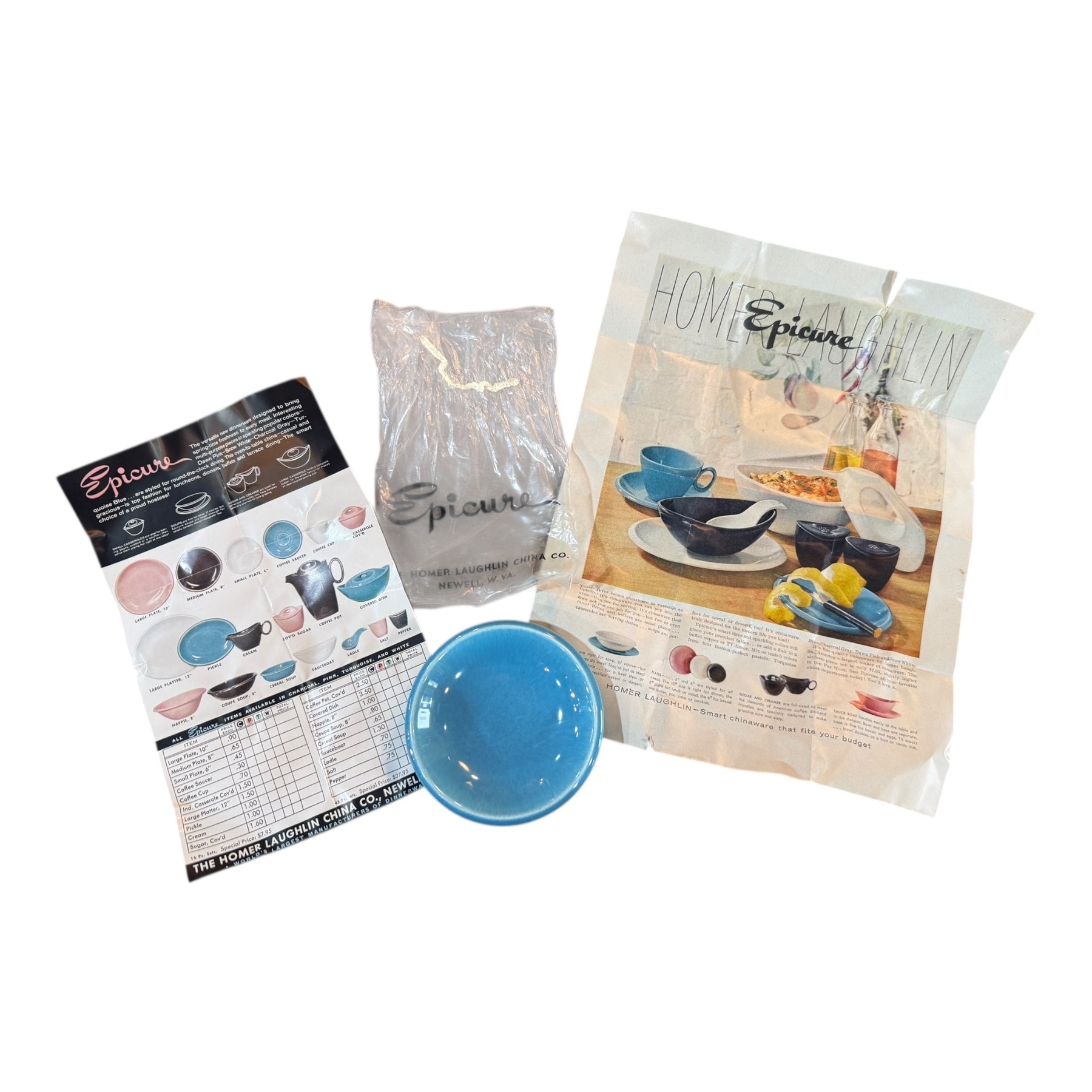 Homer Laughlin Epicure Turquoise Nut Dish with Extras.  Comes in original bag with paperwork.